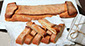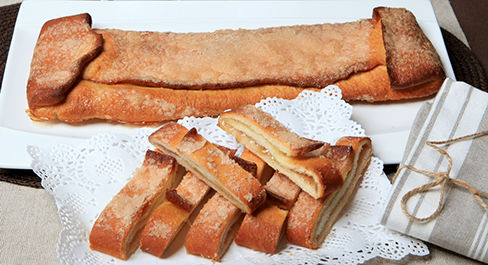 Masa de torta de huevo, estirada muy fina, rellena de almendra y miel. Resulta muy crujiente, cocida en la piedra del horno, además la combinación miel, almendras y azúcar con canela deja un regustillo muy agradable.