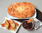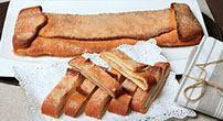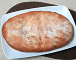 Masa de pan estirada con nuestras manos, rociada con aceite de oliva y azúcar en grano para que al cocerla sobre la piedra del horno se produzca un tostado delicioso. Es la torta para el chocolate. Combina muy bien con salado.