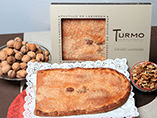 Masa de torta de huevo, estirada muy fina, rellena de nueces y miel. Cocida en la piedra del horno queda muy crujiente al paladar. Nuez, miel y azúcar con canela combinación apetitosa.